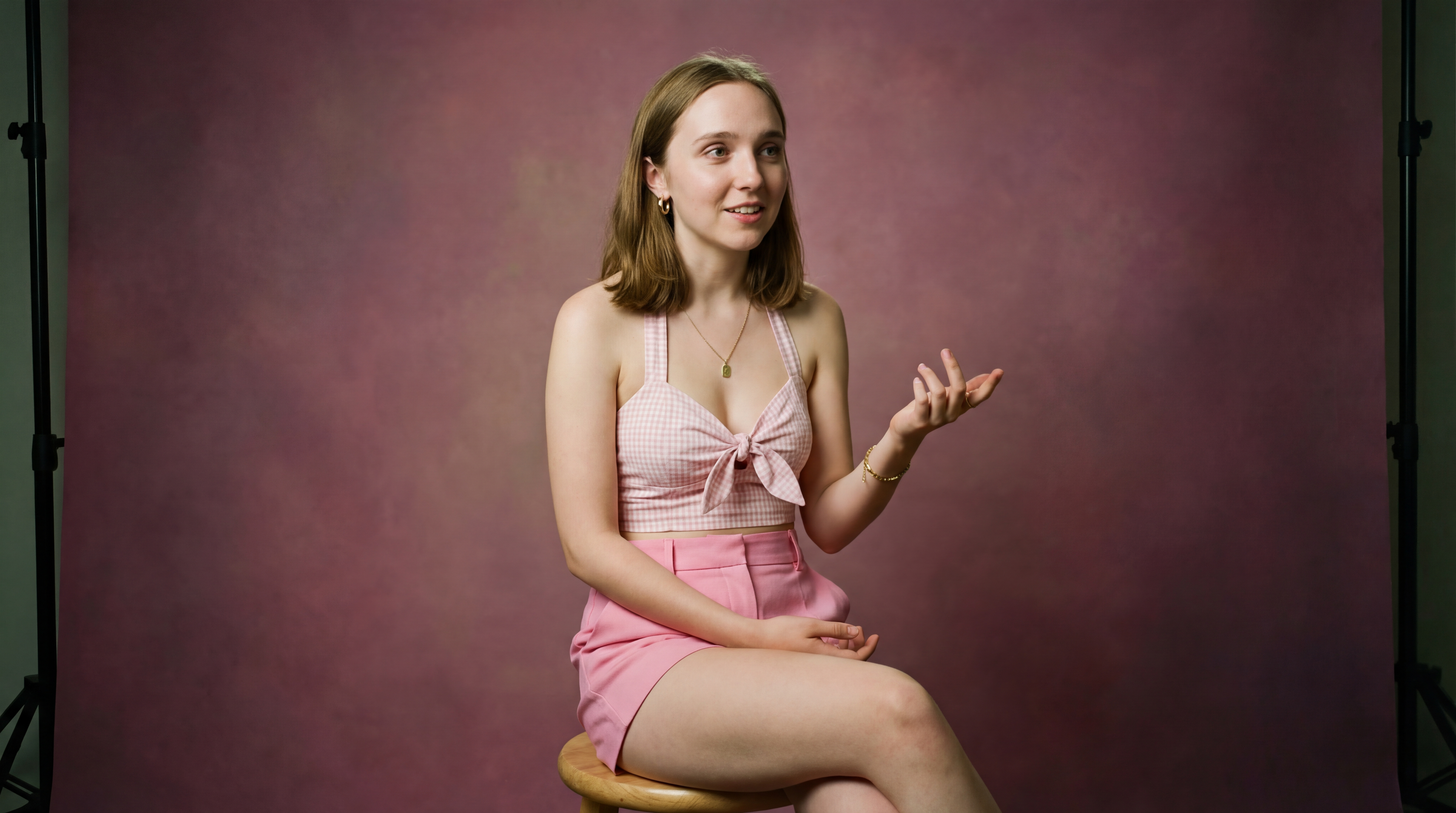 Edited high-res portrait of young woman in pink gingham outfit, vintage digital aesthetic, studio interview style.